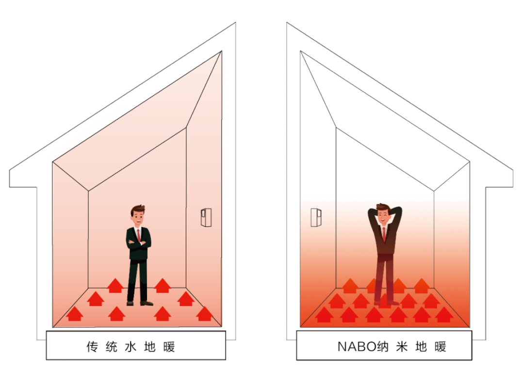 NABO漢納地暖則是利用高效遠紅外線來制熱,紅外線不熱空氣,可將熱量鎖定在人體活動的近地面范圍,進而達到高效節(jié)能的目的。同時,NABO納米地暖采用單獨回路,每個空間可獨立開關(guān),升溫快可即開即用,還可通過APP遠程開啟和關(guān)閉,室內(nèi)無人的話可低功耗保溫,回家提前2小時開啟即可,從而做到“行為節(jié)能”。